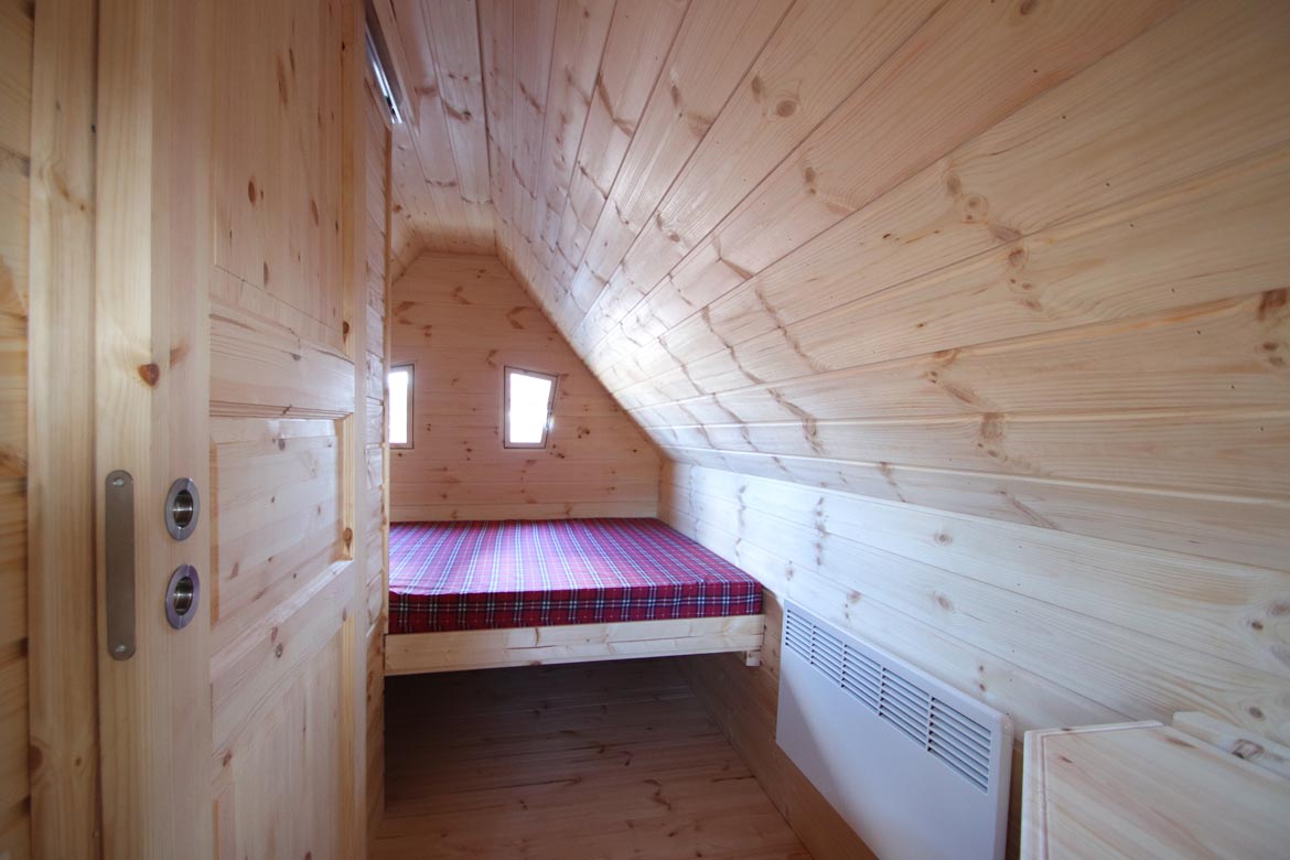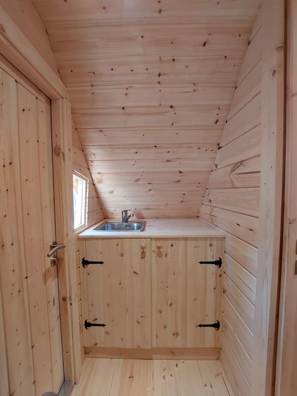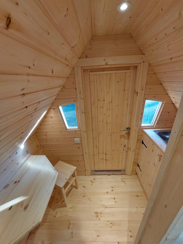 Despite its compact size, Forest Hut 4 offers a well-balanced interior layout combining sleeping, hygiene, and living space. Natural wood finishes create a warm and cozy atmosphere, while the integrated bathroom adds full functionality for longer stays.
