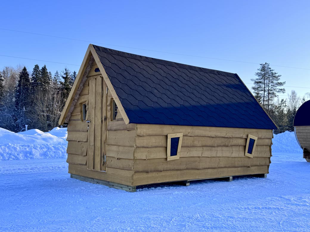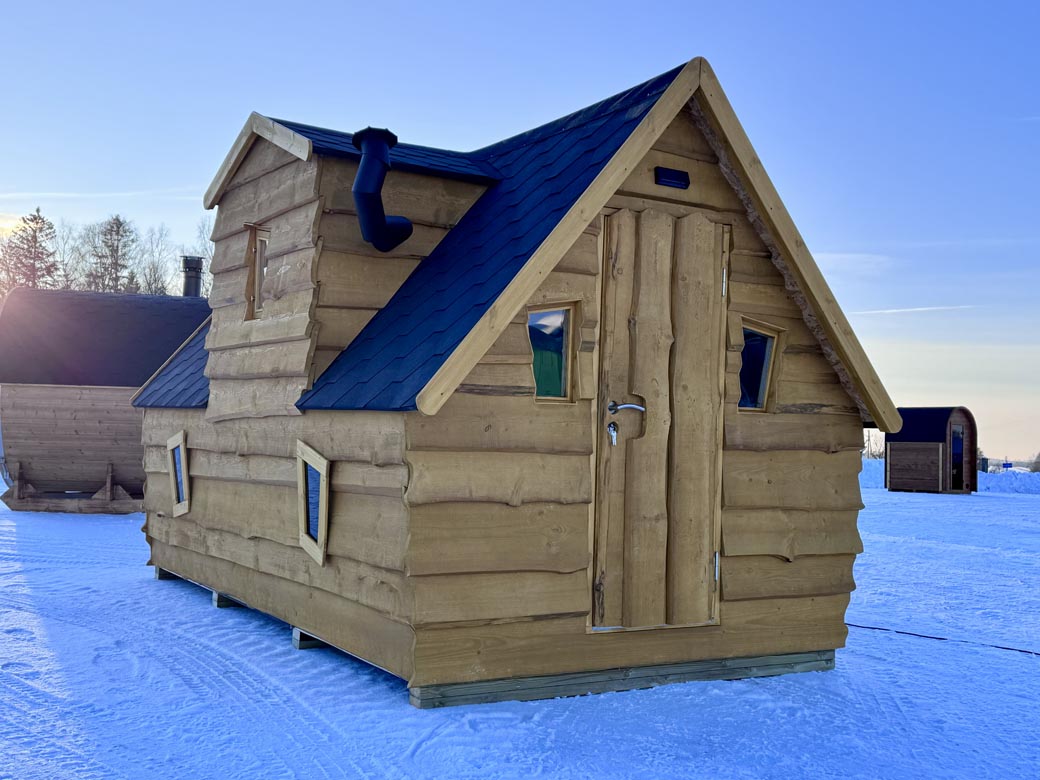 Compact fully insulated wooden camping house designed for comfortable year-round use. Thoughtfully planned layout includes sleeping, living, and bathroom areas within a compact footprint.