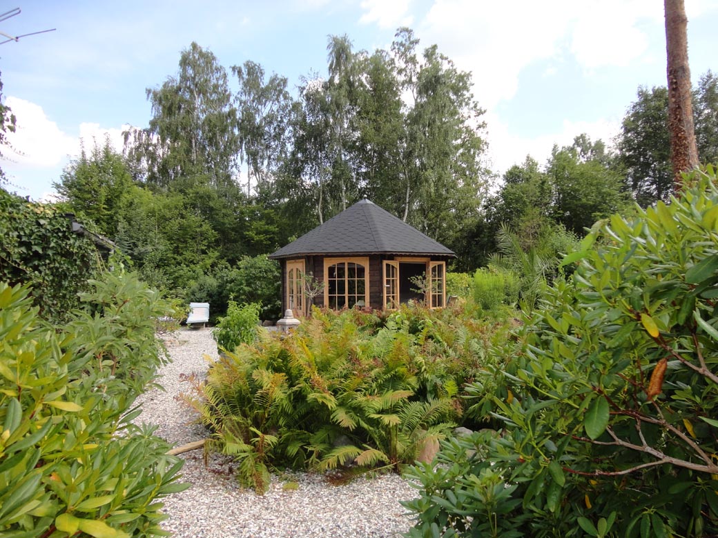 Large and elegant wooden garden house designed for comfortable outdoor living and social gatherings. Its spacious layout and window-rich design create a bright and inviting environment in any garden setting.