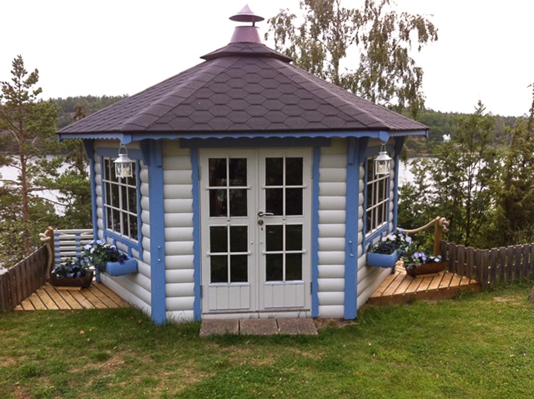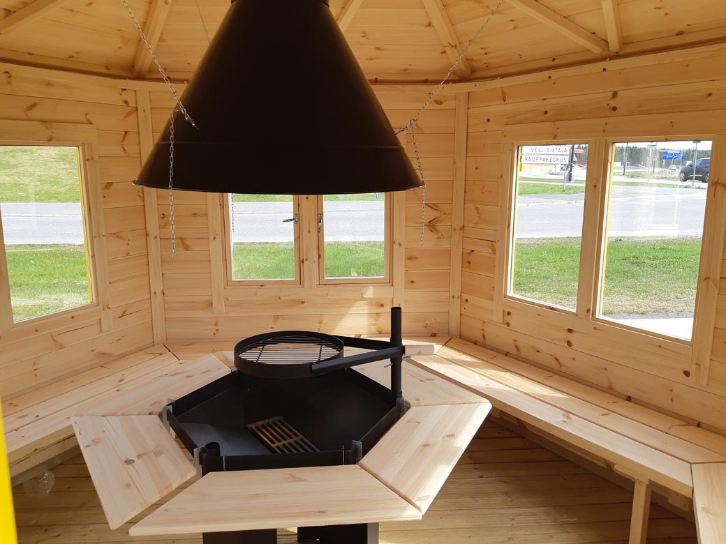 Traditional hexagonal wooden garden house designed for cozy outdoor gatherings and grilling experiences. Compact yet functional layout makes it a perfect addition to any garden or leisure space.