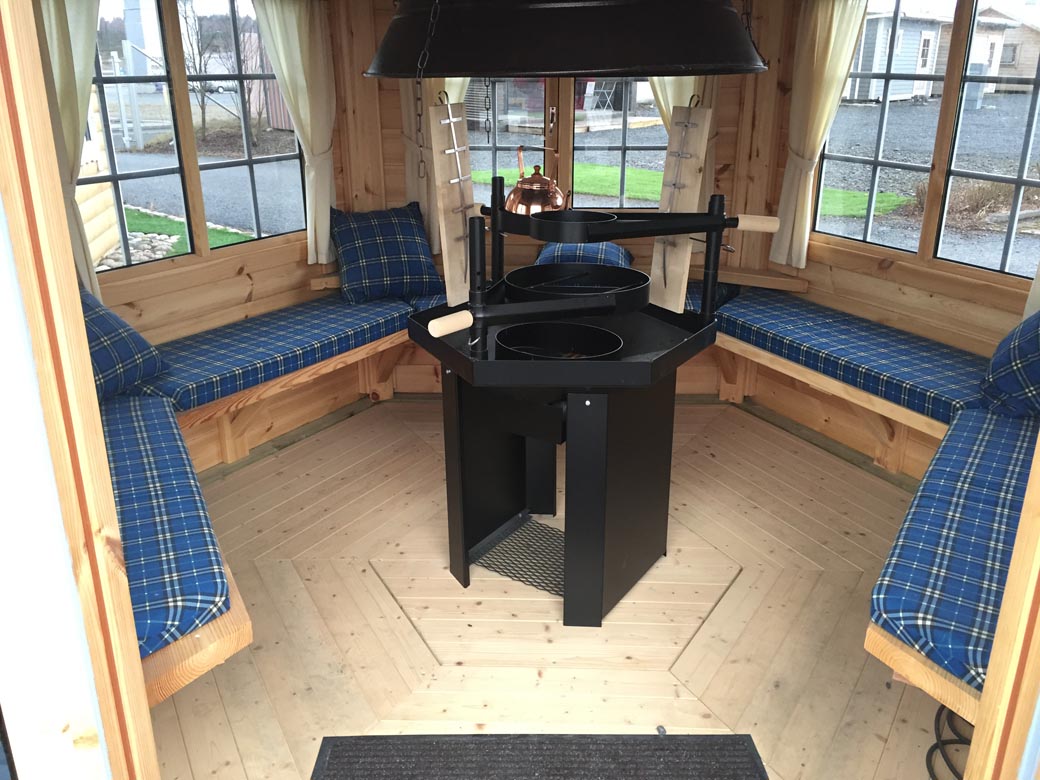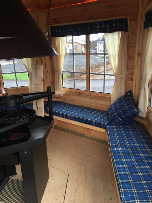The smart interior layout is centered around a grill area, surrounded by comfortable seating. Large windows create a bright and inviting atmosphere, making the space ideal for socializing in any season.