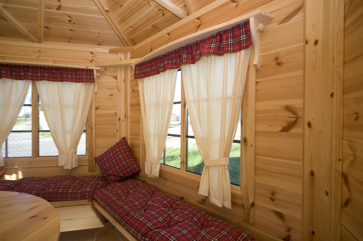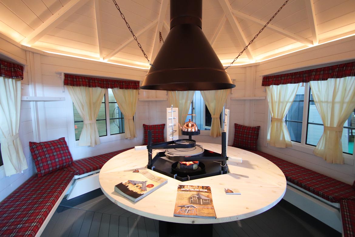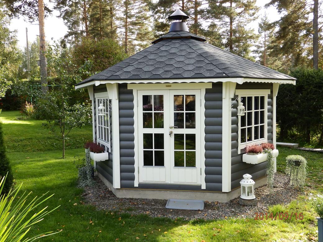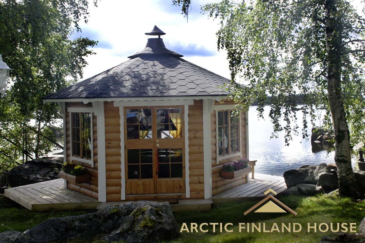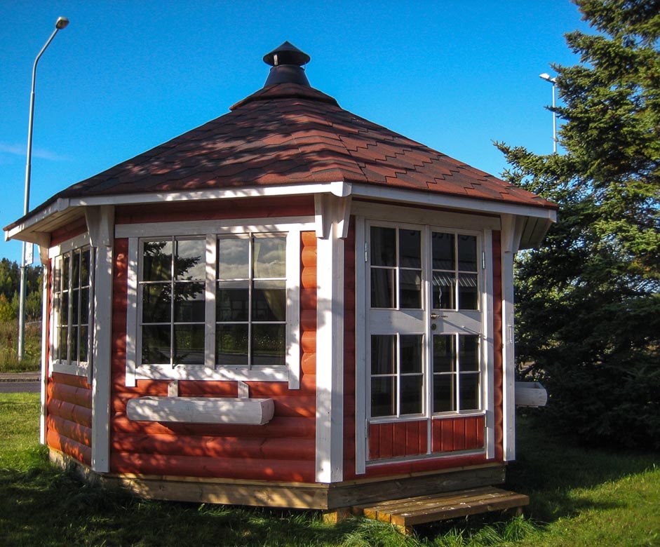 Spacious hexagonal wooden garden house up for 12 people designed for comfortable outdoor living and relaxation. Larger interior and panoramic windows create a bright and inviting space suitable for year-round use.