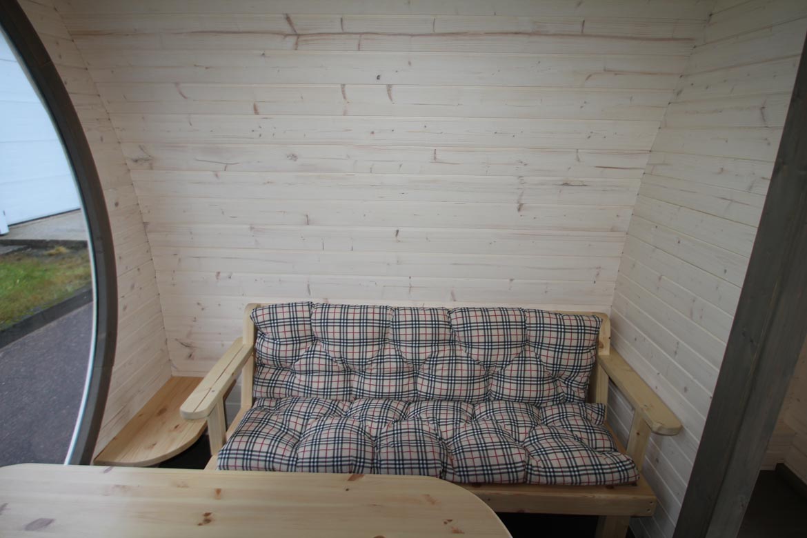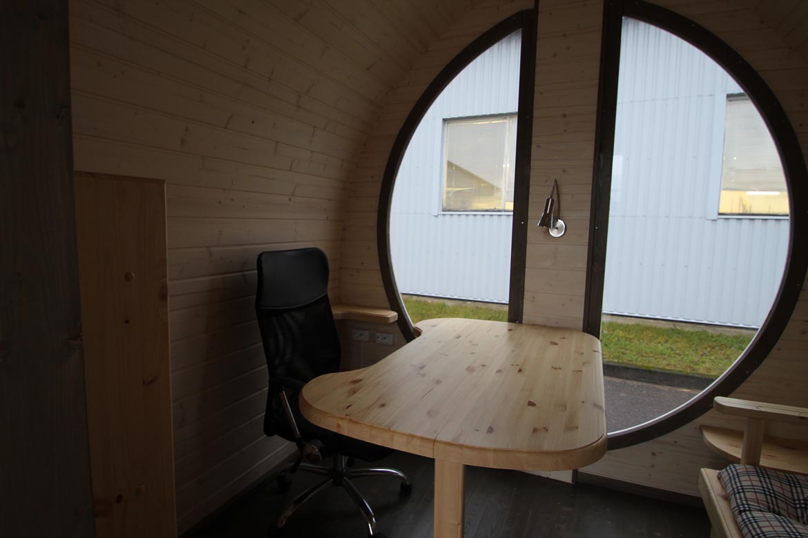The interior layout is designed for practical everyday use, providing enough space for a desk, seating, and storage. The curved structure creates a cozy and quiet atmosphere, while the large front window ensures a bright working environment.
