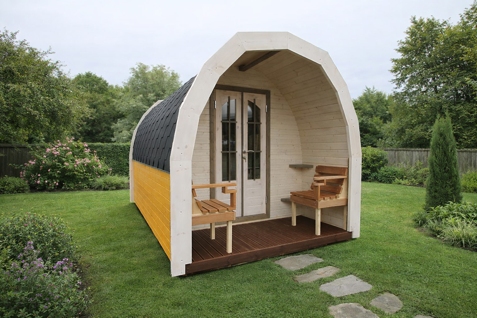 A compact and functional outdoor workspace designed to create a private and peaceful working environment in your garden or outdoor area. The Office Pod combines efficient use of space with natural light and a modern curved design, making it ideal for focused work or creative use.