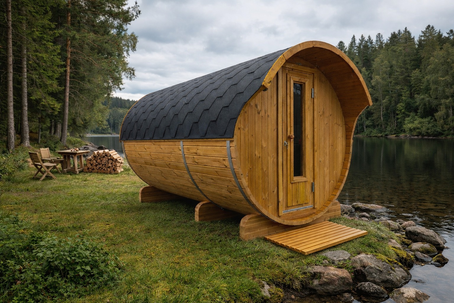 Inside, ergonomic benches provide comfortable seating for up to 4–5 people. The rounded barrel shape ensures even heat distribution, delivering a consistent and enjoyable sauna experience.