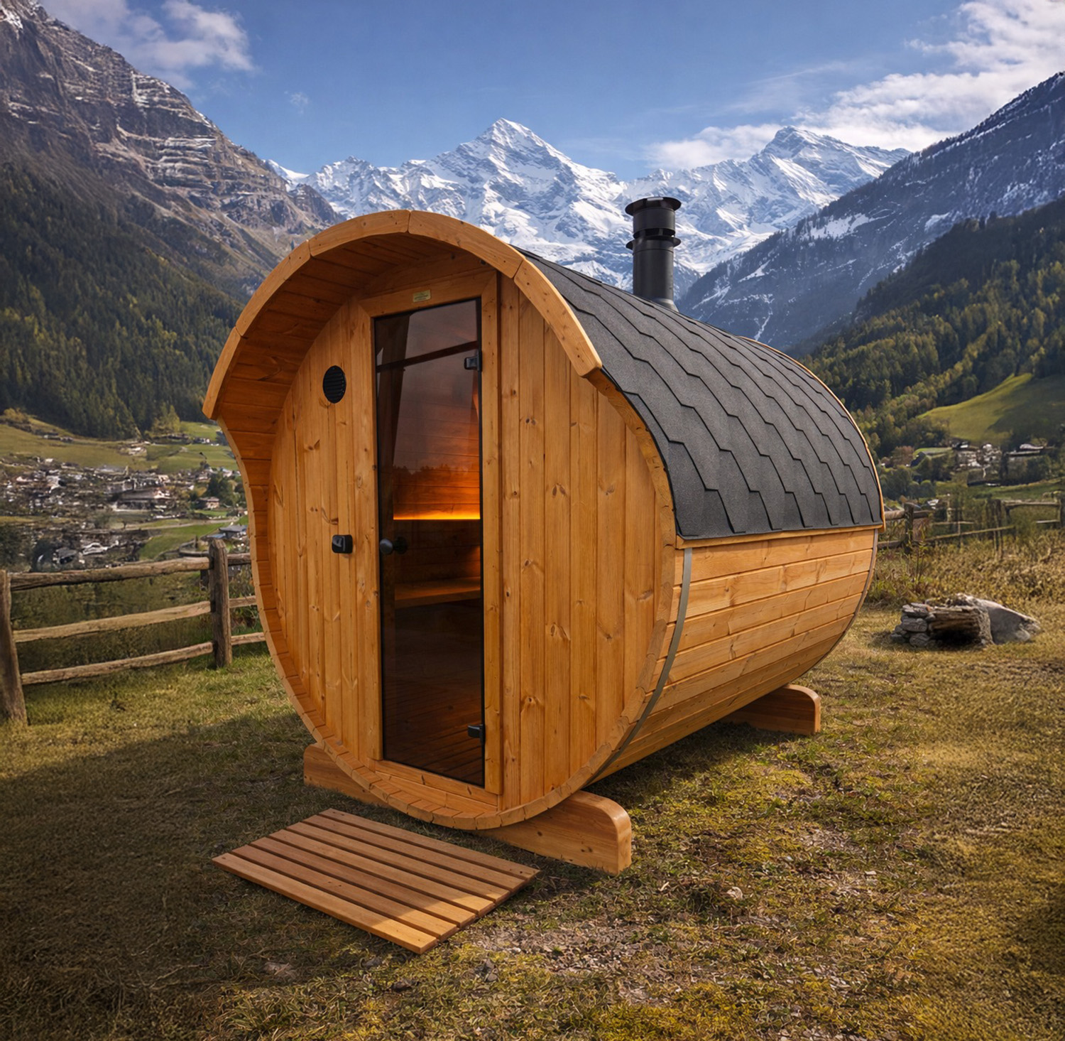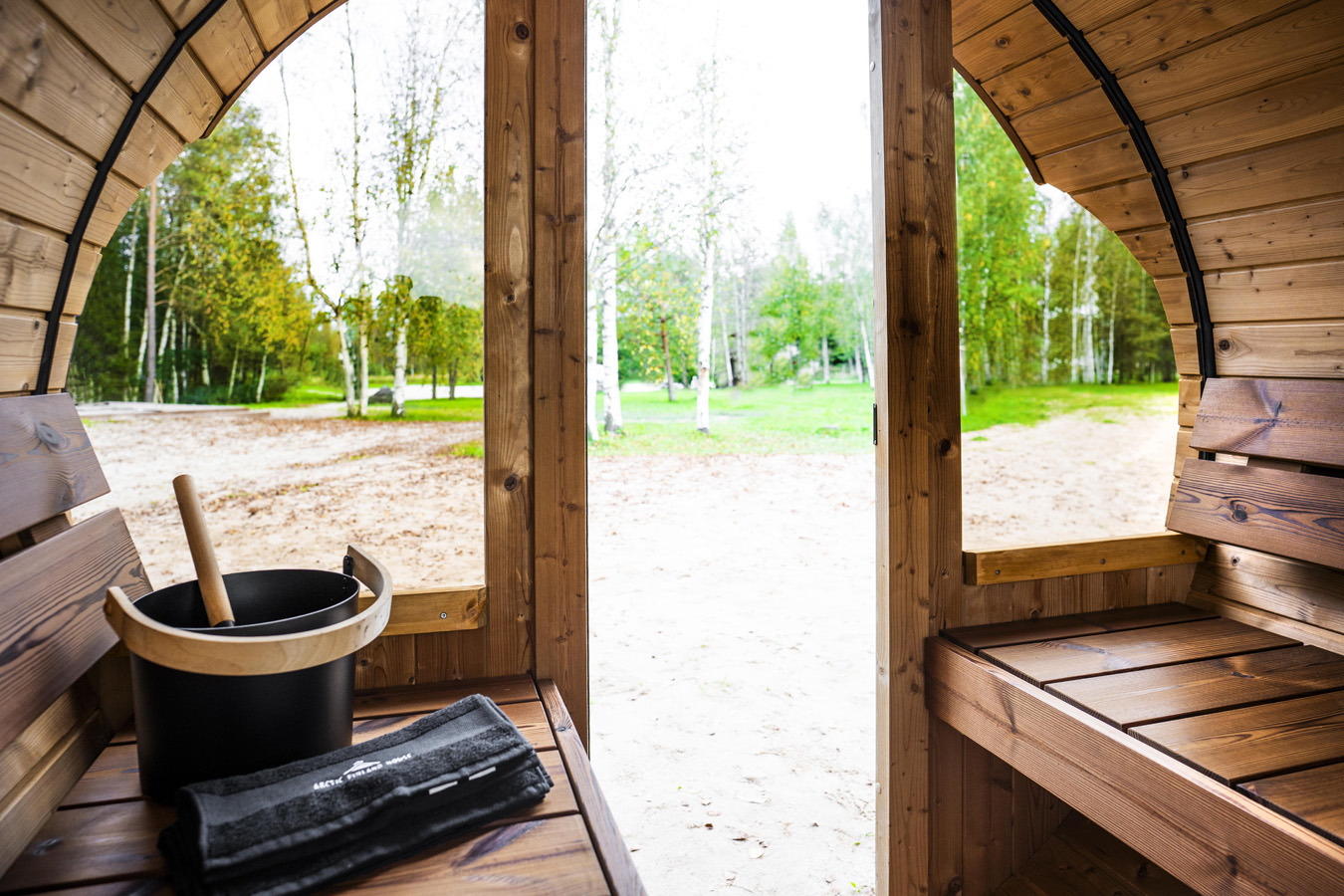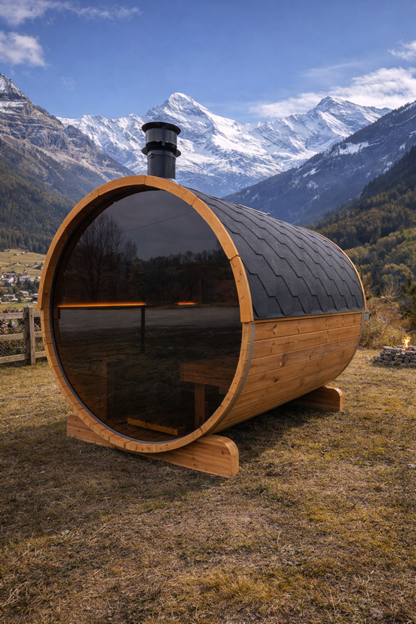 Uno is a compact barrel sauna designed for up to four people, combining efficient use of space with a comfortable and authentic sauna experience. It fits seamlessly into gardens, terraces, and holiday homes.