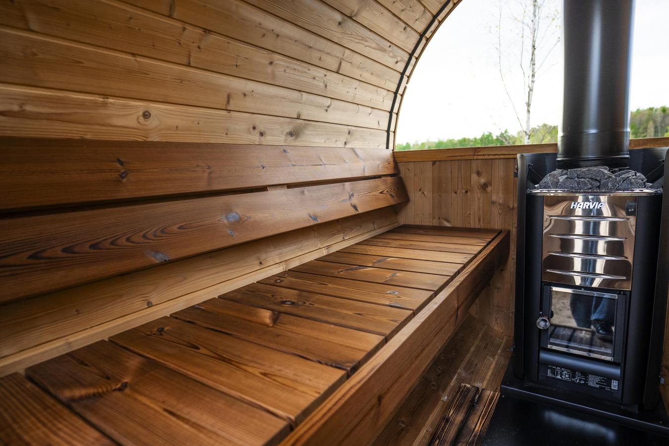 Inside, pine benches come as standard, maintaining a natural sauna feel. For a more premium finish, benches can be upgraded to light aspen or thermally treated abachi for enhanced comfort.