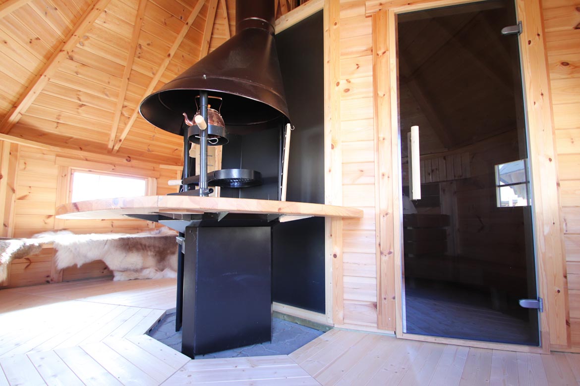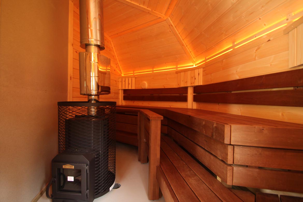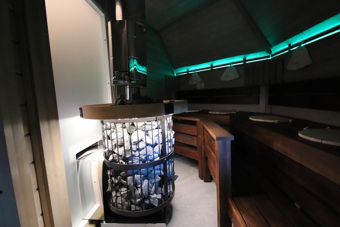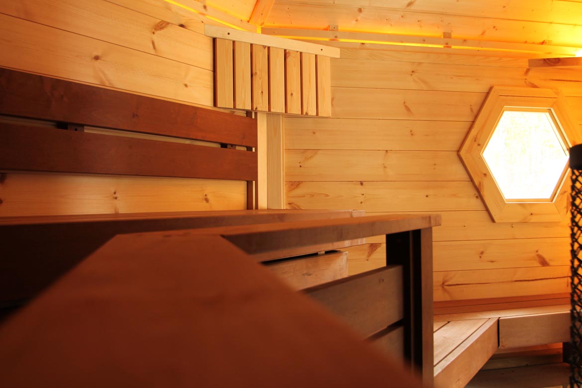 Inside the sauna, the layout ensures even heat distribution and comfortable seating, while the main room provides a warm and inviting environment for socializing.