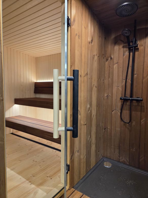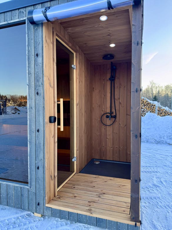 LUCA is designed as a compact wellness unit. The layout includes a dedicated entrance area with a shower, allowing you to rinse before and after sauna sessions.