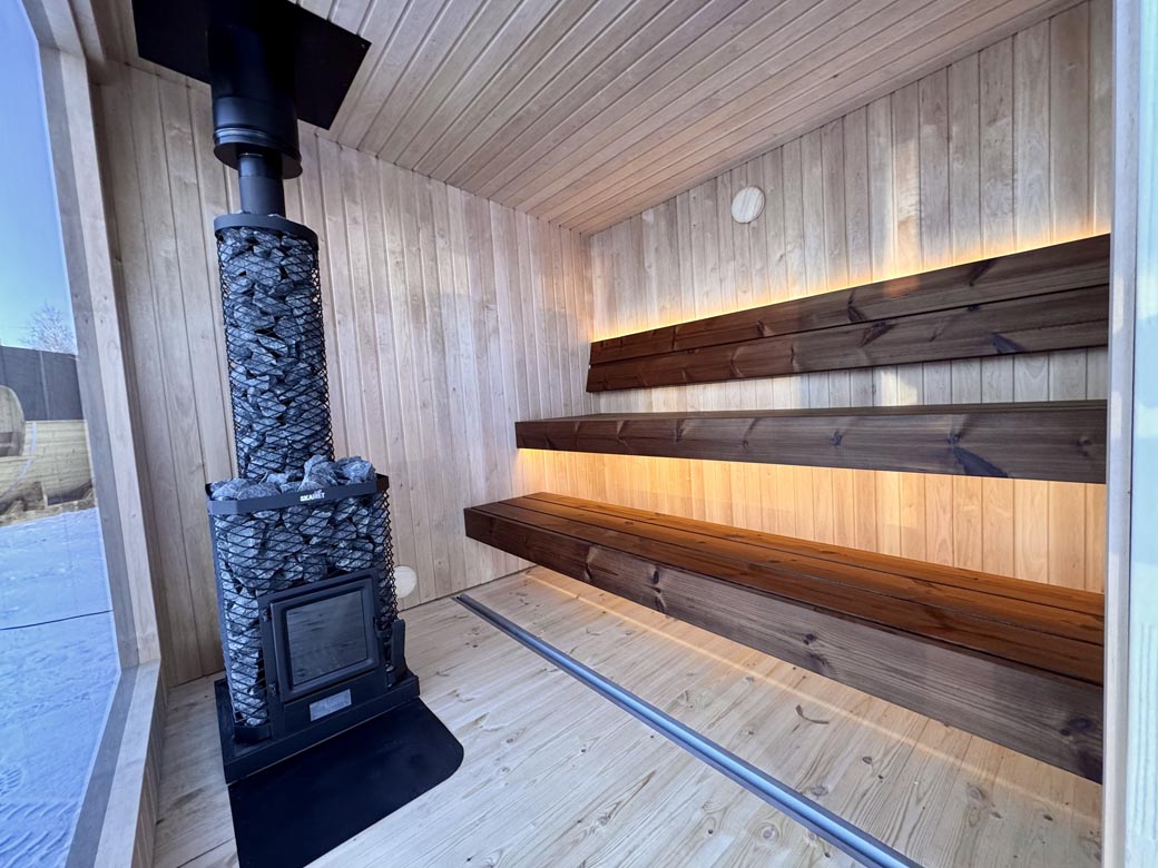 The insulated sauna room ensures fast heating and stable temperature, while the separate zones improve comfort and usability. The interior comfortably accommodates 3–5 people.