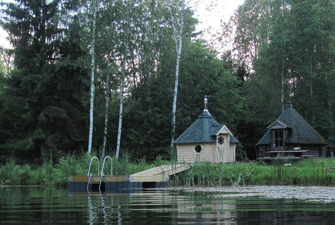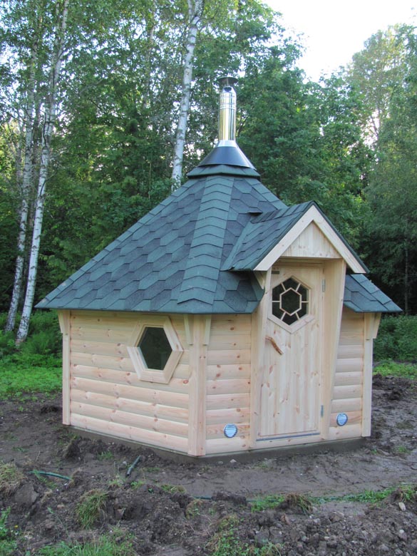 A traditional Finnish-style kota sauna designed for a cozy and authentic outdoor sauna experience. Its distinctive hexagonal shape creates a warm and inviting atmosphere, perfect for relaxing sauna sessions in nature.