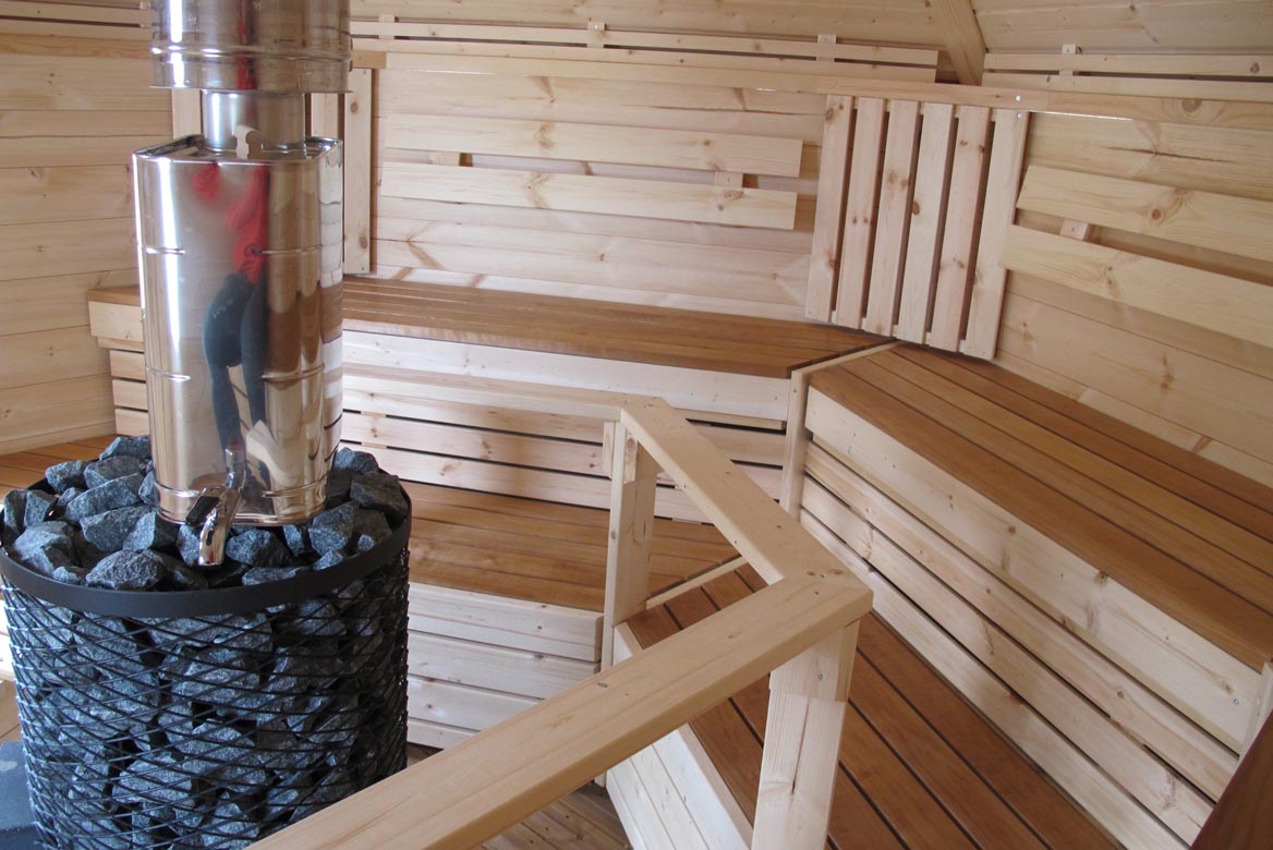 The interior layout is built around a central heater, creating an even and efficient heat distribution throughout the sauna. Surrounding benches allow comfortable seating for 4–6 people, making it ideal for social sauna sessions.