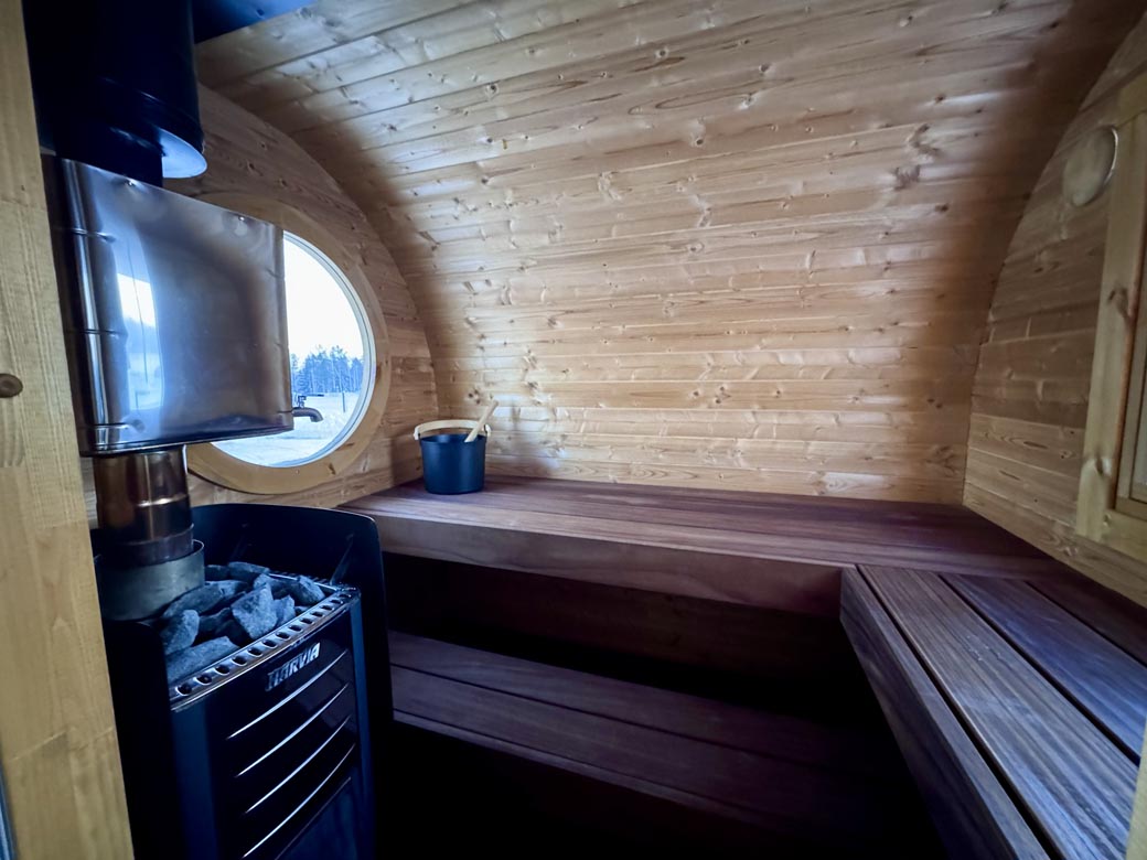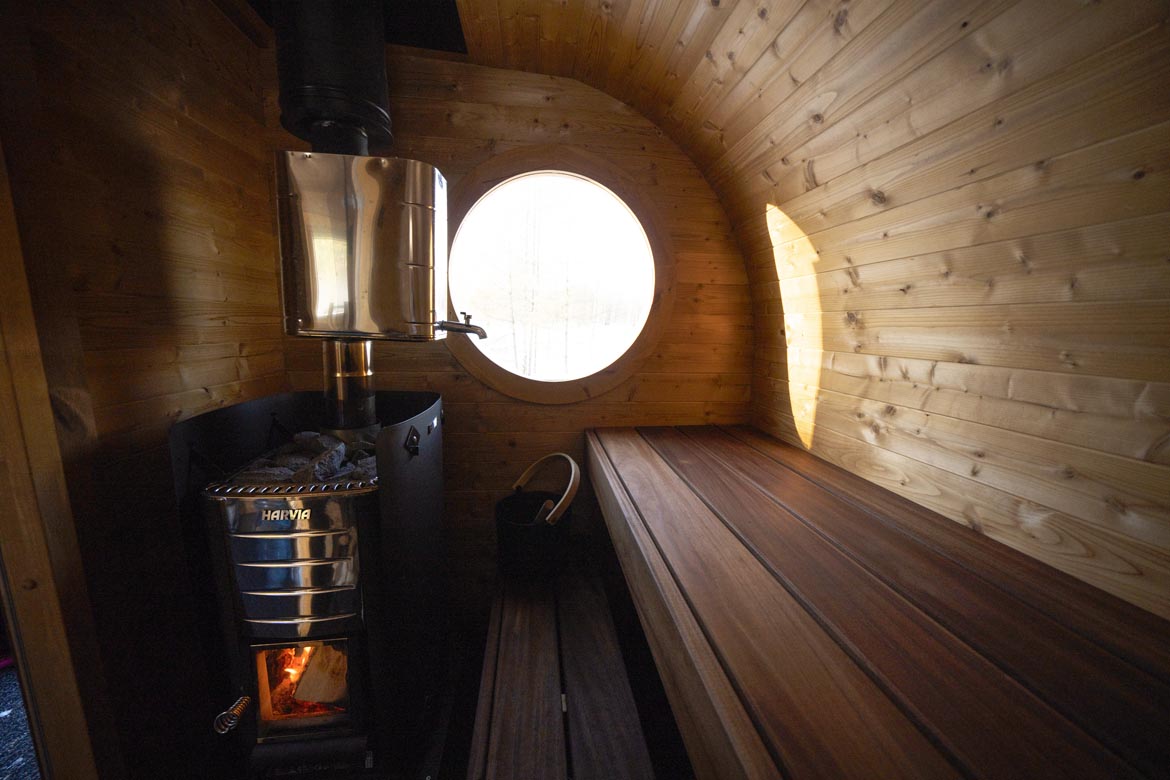 Inside, benches provide comfortable seating for 3–5 people. The wood-fired heater creates an authentic and intense sauna atmosphere, perfect for outdoor settings.