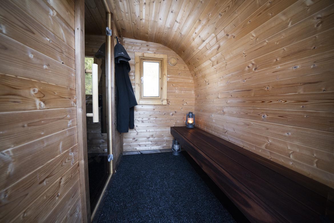 The trailer sauna is designed to deliver a classic sauna experience with the added benefit of mobility. The layout includes a dedicated sauna room and a small entrance area for improved heat retention.