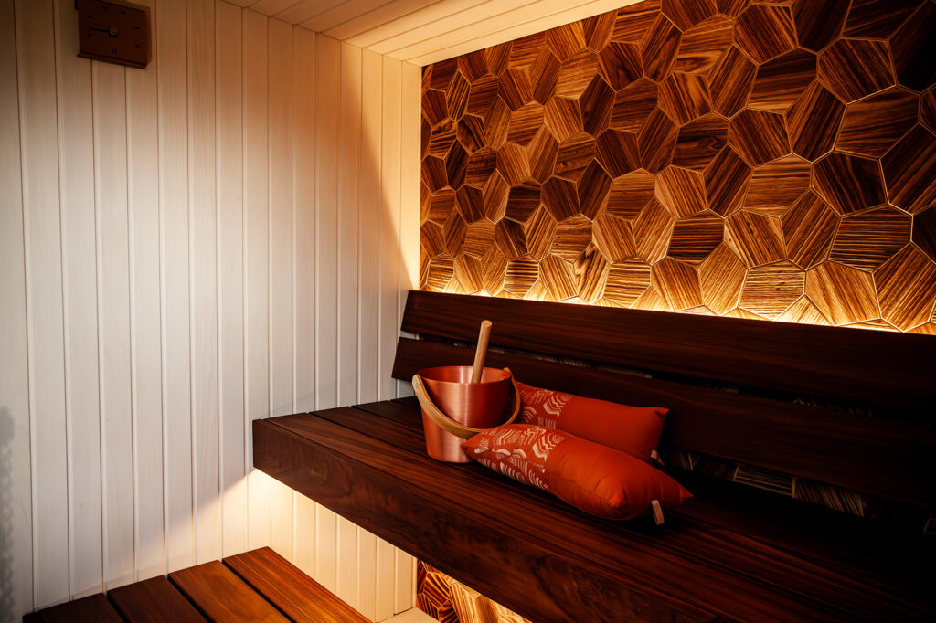 A thoughtfully designed layout – a two-level bench curving upward around the stove – creates the perfect steam room, where heat flows smoothly and soft steam spreads evenly into every corner. This design ensures an ideal spot for each sauna-goer to relax.