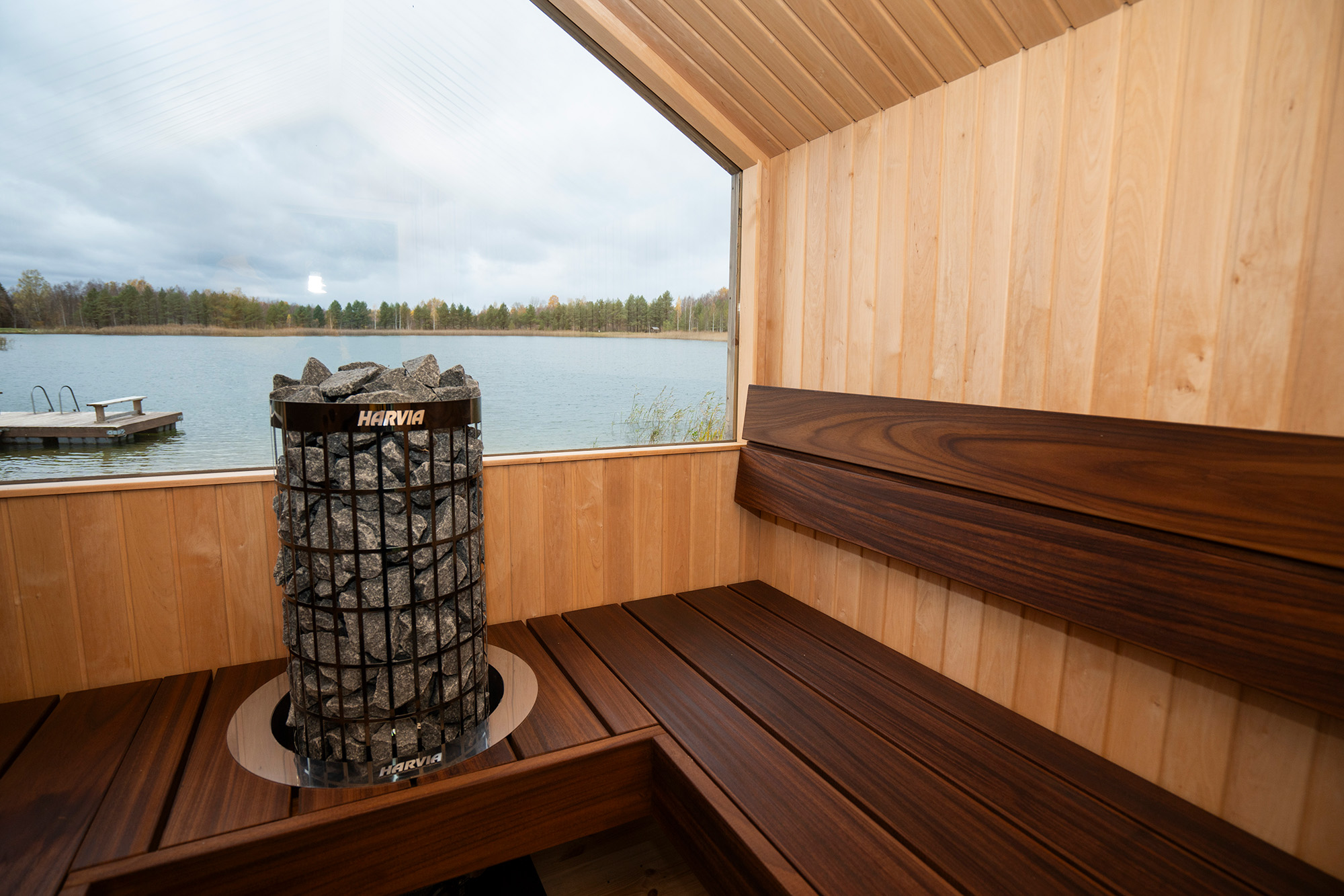 Sauna interior: aspen wood panelling, sauna benches made of thermo-treated abachi wood